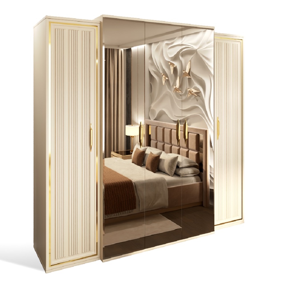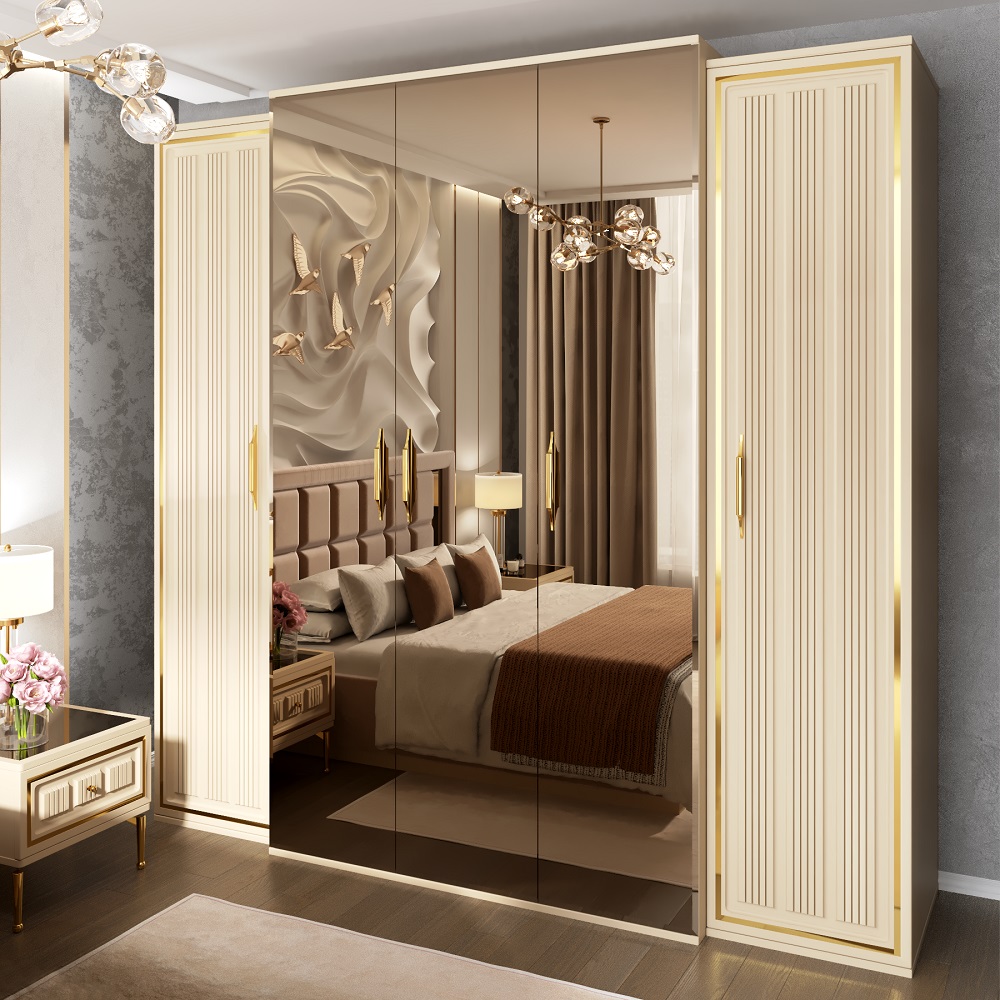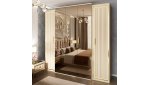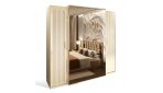 Внутреннее наполнение шкафа выполнено по стандартам гардеробной и укомплектован полки для белья и штанга для одежды. Фасады оснащены фурнитурой с доводчиком и украшены металлизированным латунным декором — этот тренд сезона является авторским стилем фабрики Эра и такой же декор используется в спальне Lara – это расширяет возможности и позволяет миксовать коллекции новинок. Шкафы выпускаются 4х (1+2портал+1) и 5ти (1+3портал+1) створчатые самые функциональные варианты.