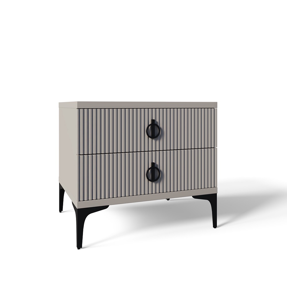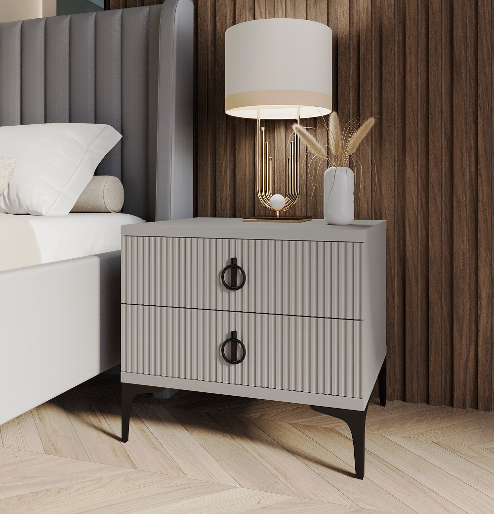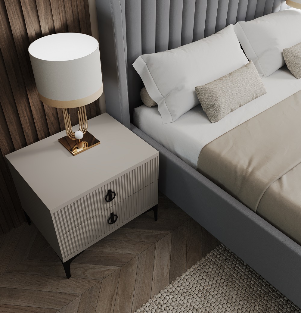 Каждая деталь спальни тщательно продумана, чтобы подарить вам не только максимальный комфорт и эстетическое удовольствие, но и уверенность в высоком качестве мебели. Корпуса и столешницы модулей выполнены из ламинированной древесной плиты европейского качества, Фасады из природного МДФ задекорированы рельефной фрезеровкой и авторский стиль фабрики ЭРА — это финишное покрытие матовая итальянская эмаль ярко серого цвета.