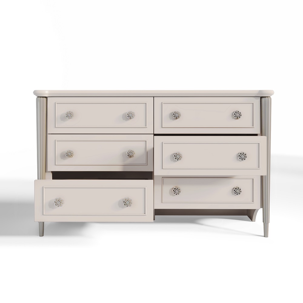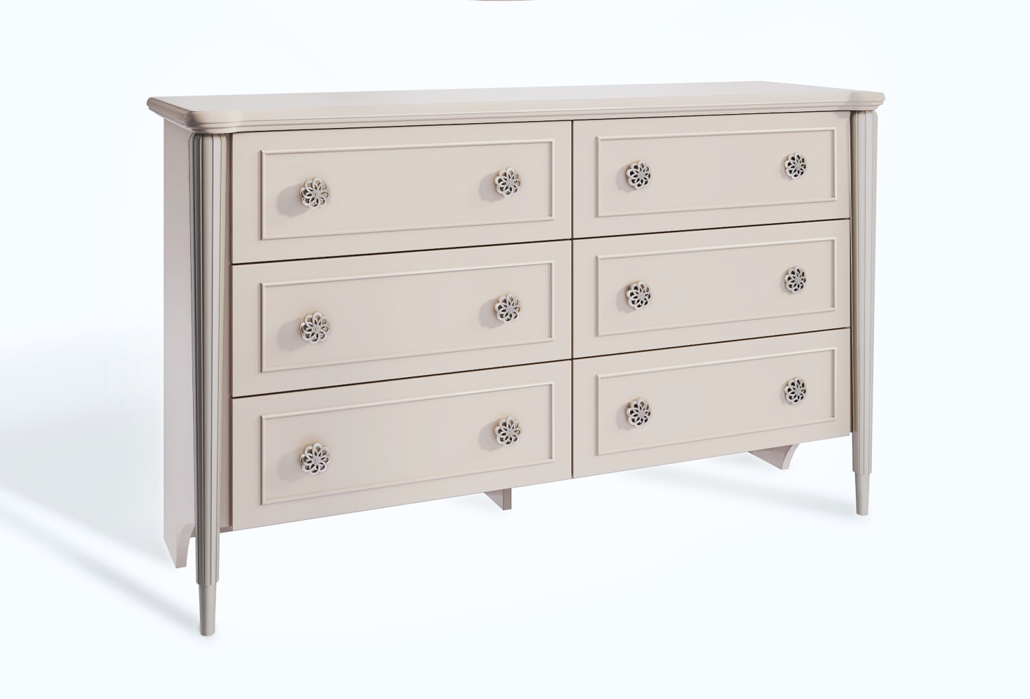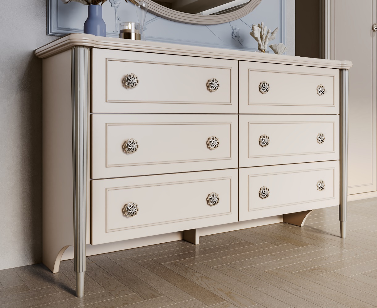 Широкий комод с шестью вместительными выдвижными ящиками украсит вашу спальню, гардеробную или прихожую, превратив хранение вещей в удовольствие.