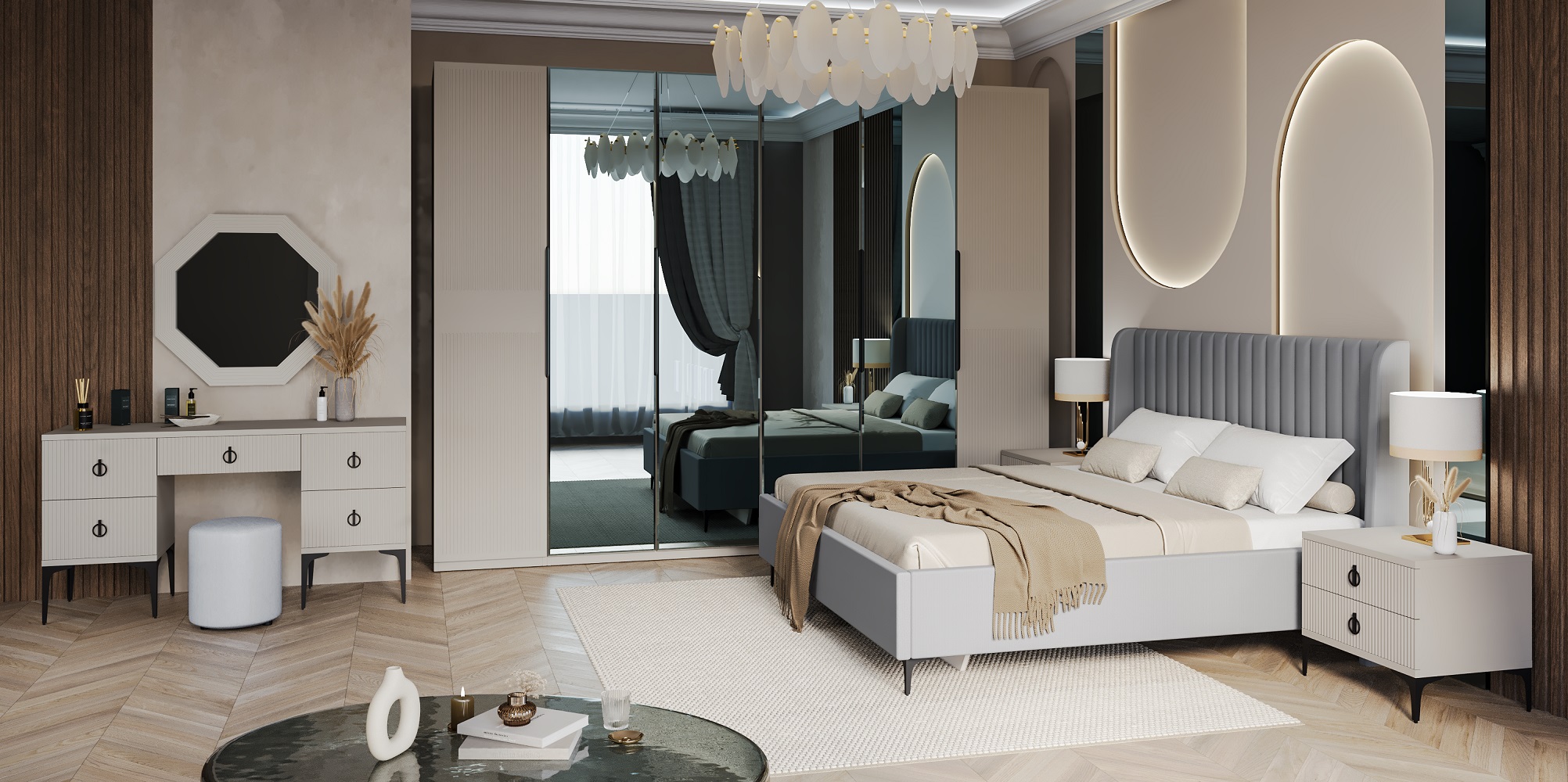Каждая деталь спальни тщательно продумана, чтобы подарить вам не только максимальный комфорт и эстетическое удовольствие, но и уверенность в высоком качестве мебели. Корпуса и столешницы модулей выполнены из ламинированной древесной плиты европейского качества, Фасады из природного МДФ задекорированы рельефной фрезеровкой и авторский стиль фабрики ЭРА — это финишное покрытие матовая итальянская эмаль ярко серого цвета.