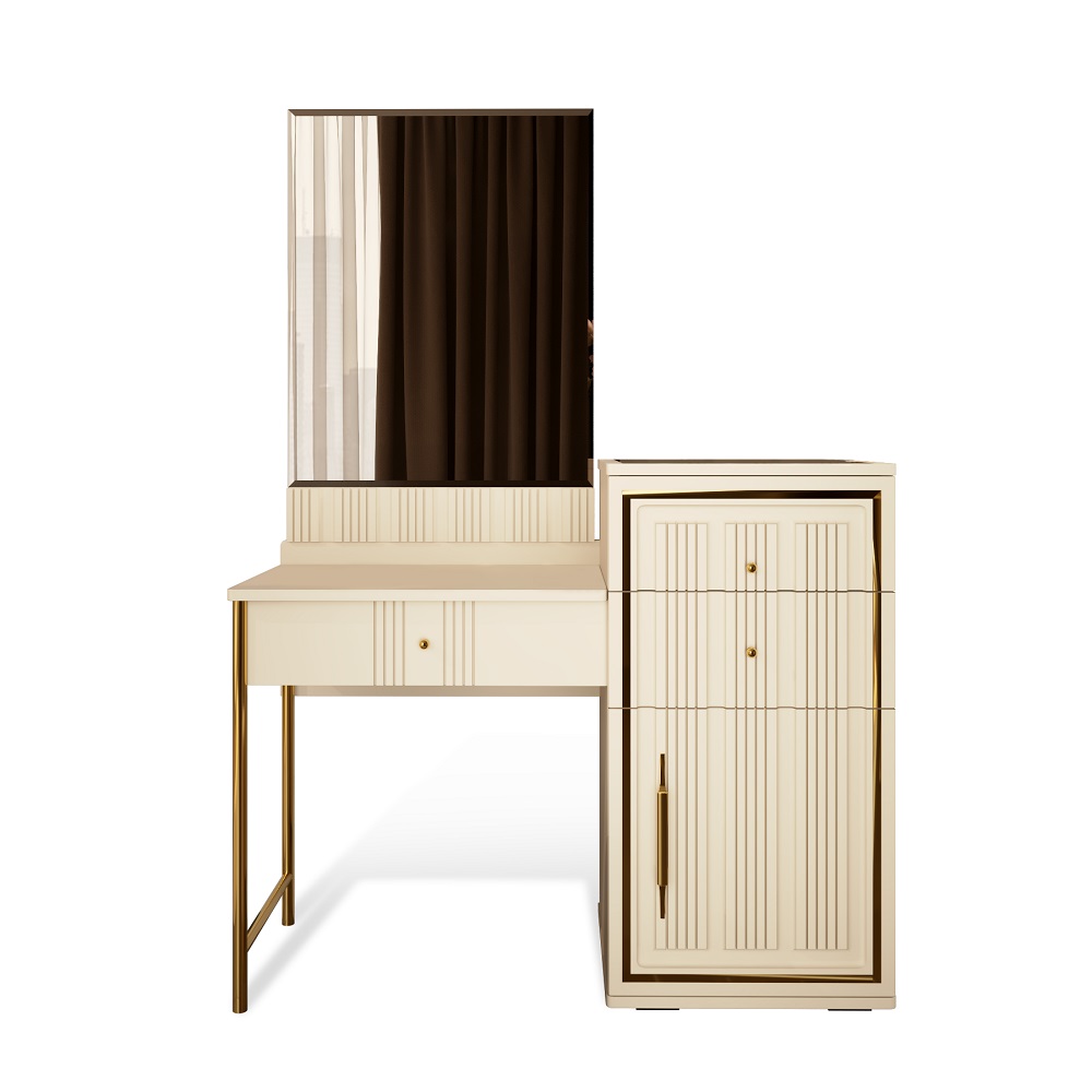 Прикроватные тумбочки с эффектом парения, туалетный стол на лёгких металлических опорах с топами из крашеного итальянской эмалью МДФ с модным декором стеклянной бронзированной поверхностью выгодно подчеркнут стиль спальни. Спальня оснащена современными европейскими механизмами с доводчиками.
