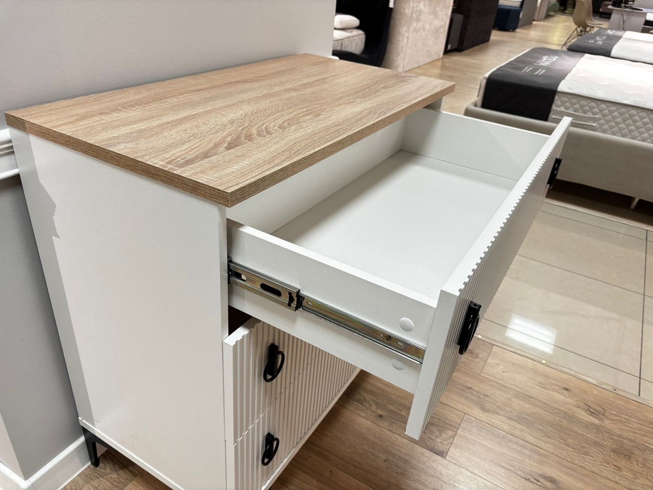 Дополняют кровать стильные и функциональные прикроватные тумбы "Стелла". Их рельефные фрезерованные фасады и элегантные ручки делают их настоящим украшением спальни. Ящики оснащены современными бесшумными механизмами с доводчиком Внутри достаточно места для хранения личных вещей.
