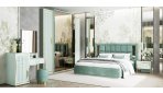 Прикроватные тумбочки с эффектом парения, туалетный стол на лёгких металлических опорах с топами из крашеного итальянской эмалью МДФ с модным декором стеклянной бронзированной поверхностью выгодно подчеркнут стиль спальни. Спальня оснащена современными европейскими механизмами с доводчиками.