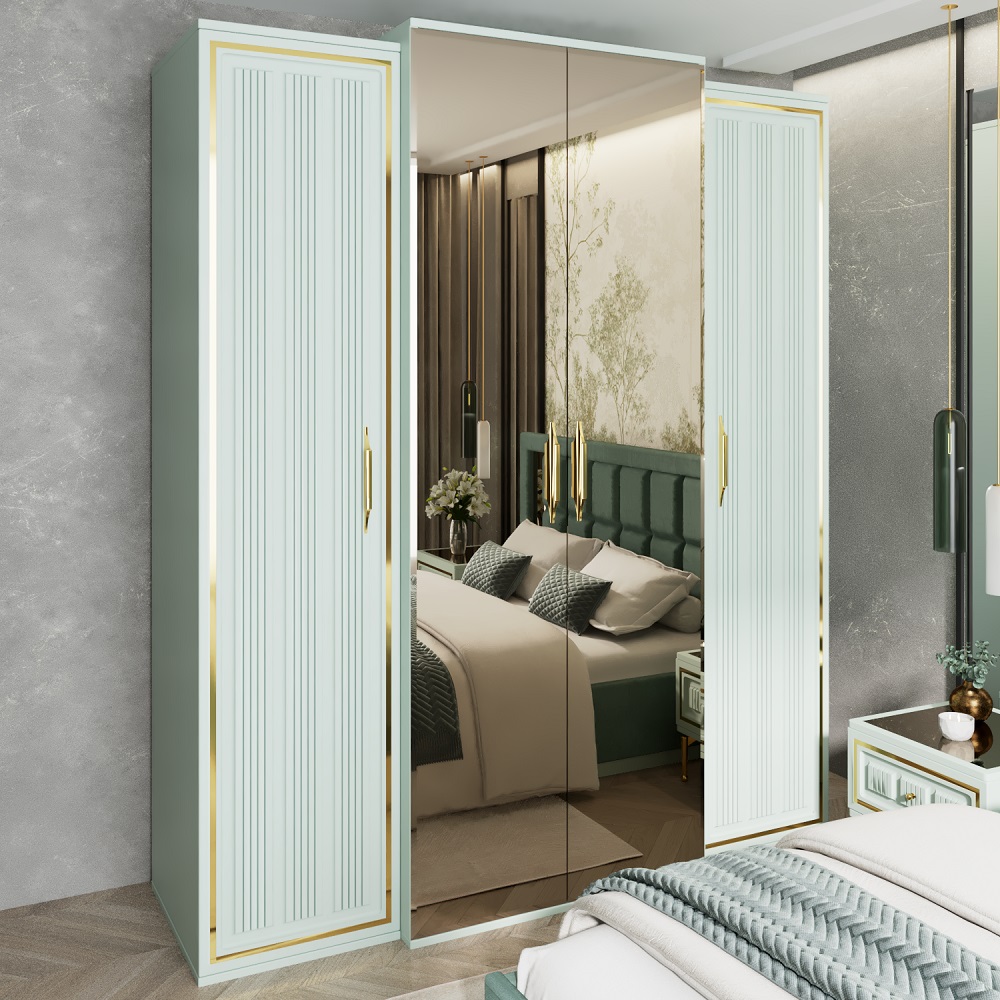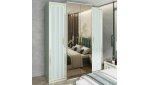 Внутреннее наполнение шкафа выполнено по стандартам гардеробной и укомплектован полки для белья и штанга для одежды. Фасады оснащены фурнитурой с доводчиком и украшены металлизированным латунным декором — этот тренд сезона является авторским стилем фабрики Эра и такой же декор используется в спальне Lara – это расширяет возможности и позволяет миксовать коллекции новинок. Шкафы выпускаются 4х (1+2портал+1) и 5ти (1+3портал+1) створчатые самые функциональные варианты.