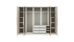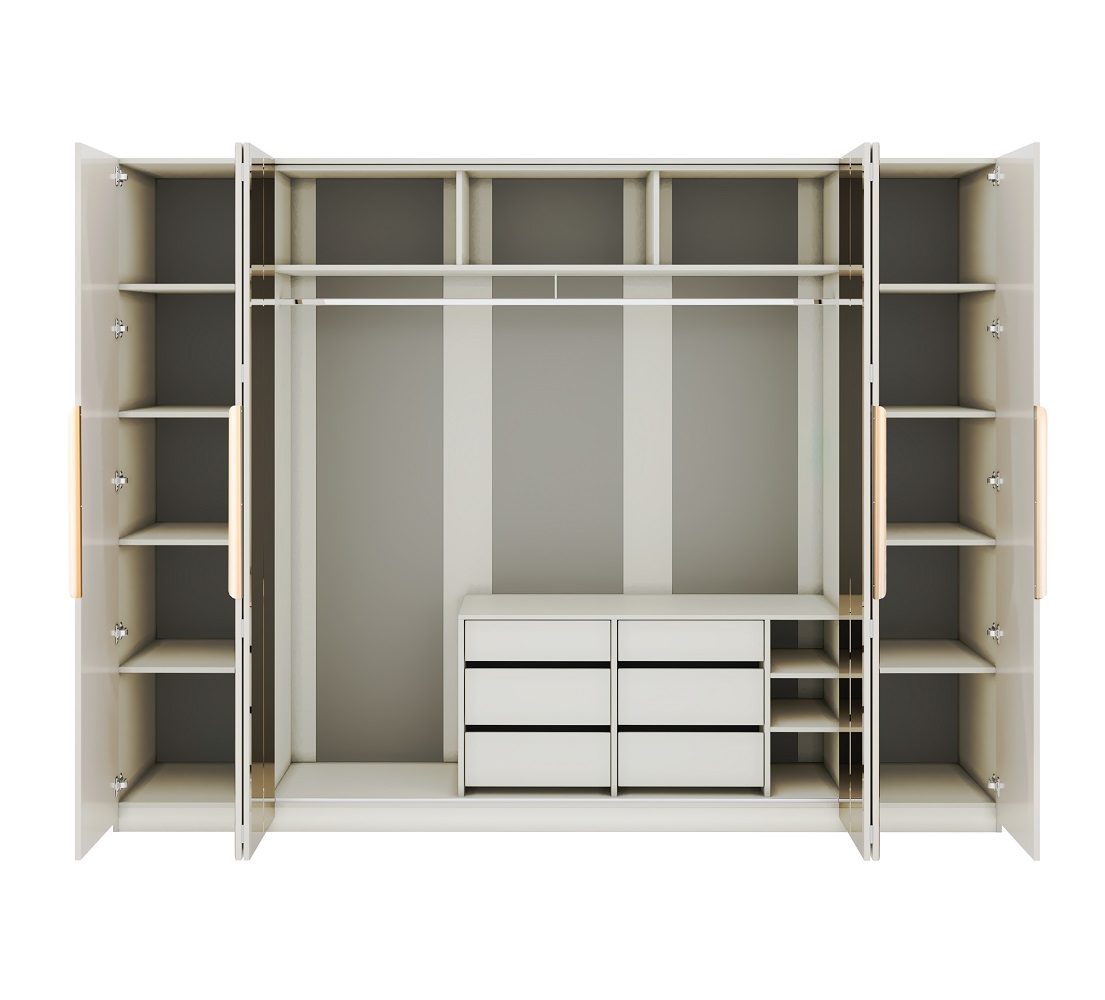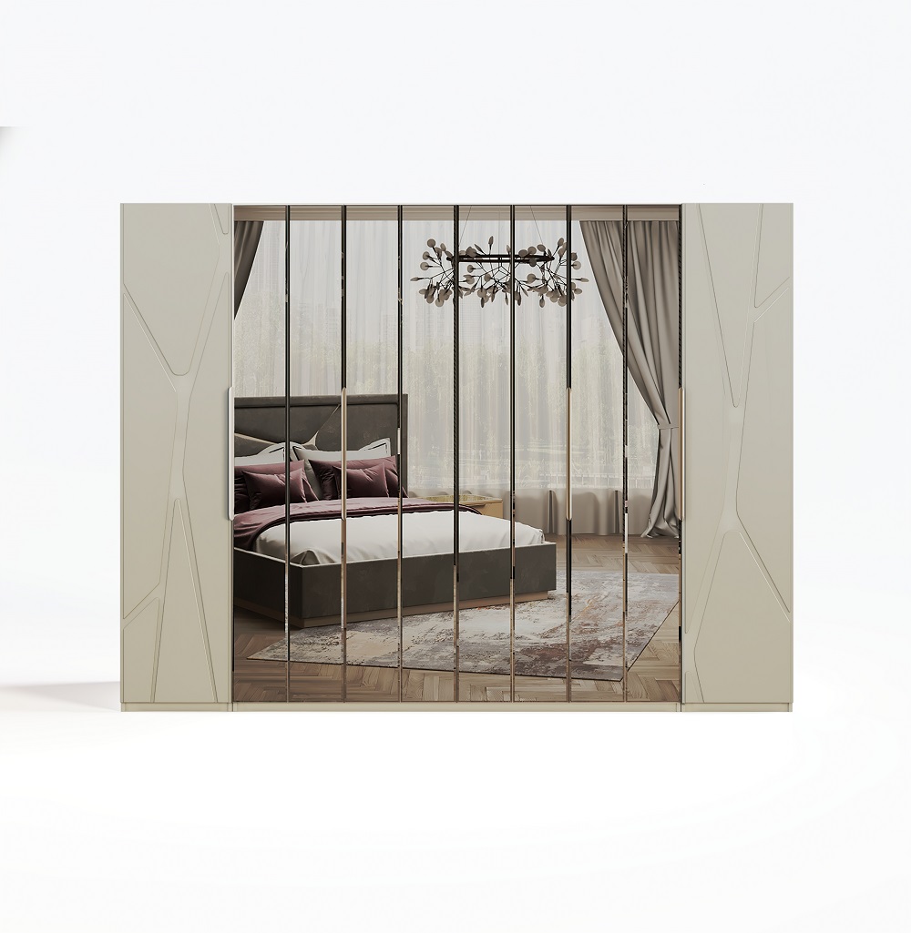 Шкафы представлены двумя моделями: четырёхдверный и шестидверный варианты. Фасады из фрезерованного МДФ, украшенные узорами мозаичного типа, вместе с зеркалами превращаются в настоящий живой калейдоскоп, наполняющий пространство таинственным свечением и игрой света. Внутренний механизм складных дверей позволяет экономить пространство, а качественная фурнитура продлевает срок службы шкафа и дарит наслаждение бесшумной работой.